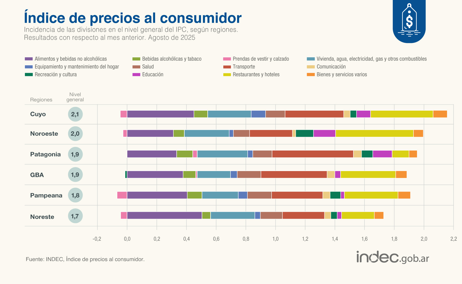 En términos de incidencia regional, la canasta de Alimentos y bebidas no alcohólicas tuvo el mayor peso en la variación mensual de las regiones Pampeana, Noreste y Cuyo. En cambio, en el Gran Buenos Aires (1.9% para el AMBA) y en la Patagonia predominó Transporte, mientras que en el Noroeste se destacó Restaurantes y hoteles.
