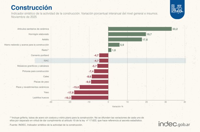 En tanto, la construcción se hundió 4,1% desestacionalizado en noviembre y anotó su peor registro en más de un año. El Indicador sintético de la actividad de la construcción (ISAC) que elabora el Instituto Nacional de Estadísticas y Censos (Indec) extendió su caída tras lo que fue el descenso de octubre.