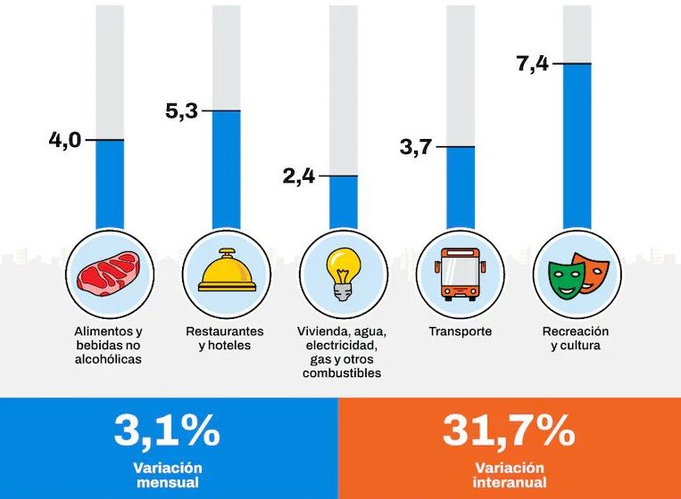 El reporte del organismo estadístico indicó que la variación de enero respondió fundamentalmente a las subas en las siguientes divisiones: Recreación y cultura, Restaurantes y hoteles, Alimentos y bebidas no alcohólicas, Seguros y servicios financieros y Transporte.