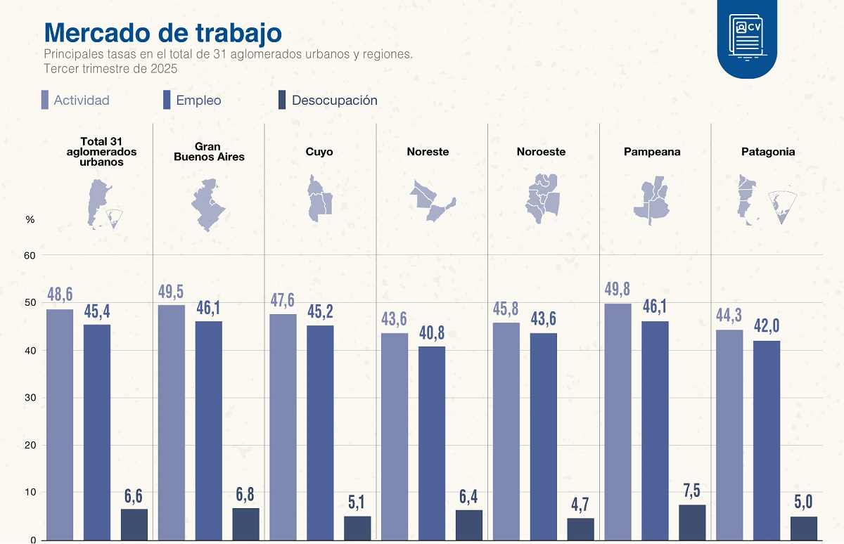 Al observar la dinámica por región, Gran Buenos Aires se ubicó en el primer lugar con 8,6% de desocupación, secundado por el área pampeana (7,7%), el Noreste (5,6%), Cuyo (4,9%), la Patagonia (4,8%) y el Noroeste (4,2%).
